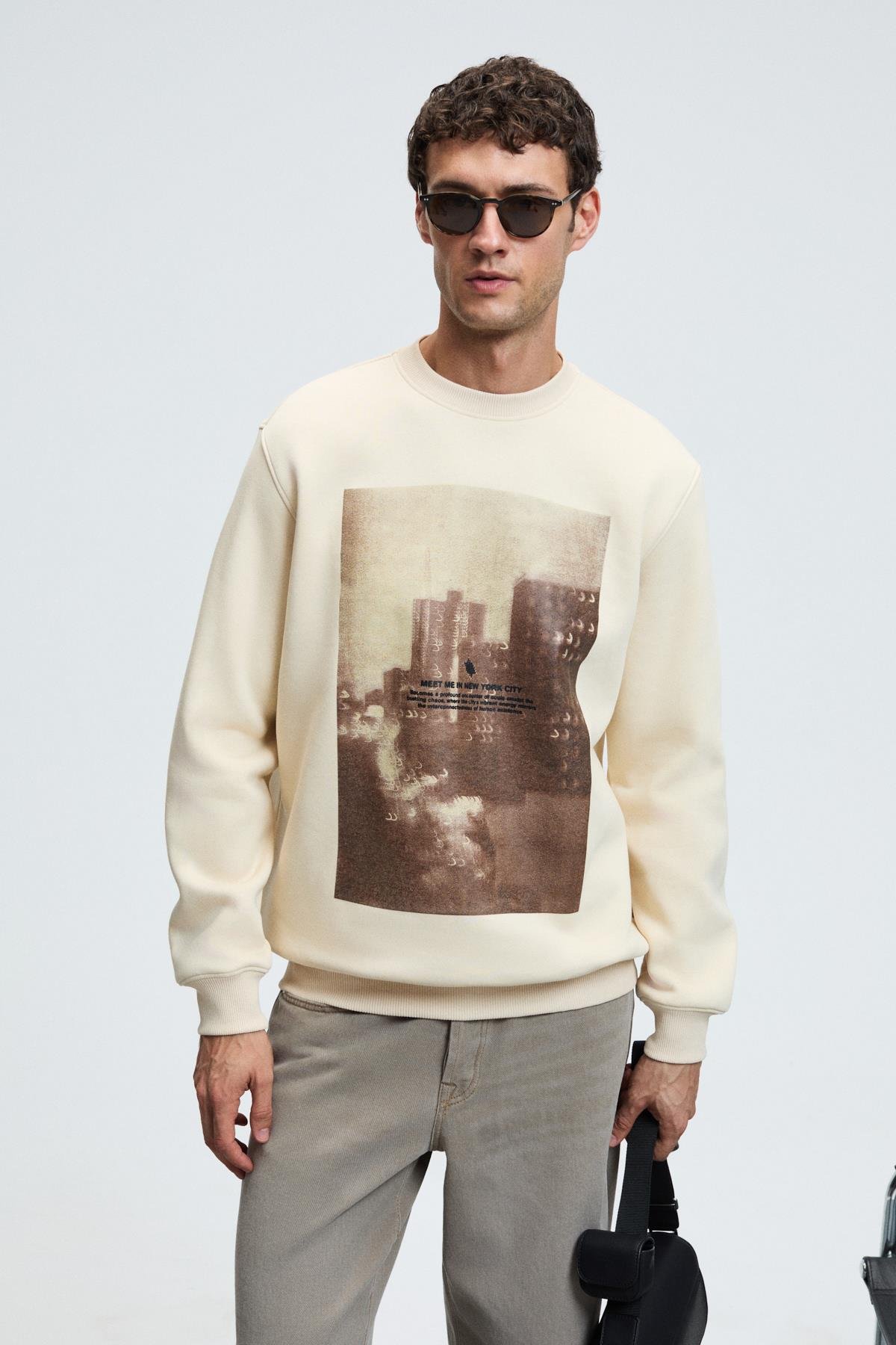 ALARIC Erkek Yuvarlak Yaka Önü Baskılı Regular Fit Ekru Sweatshirt