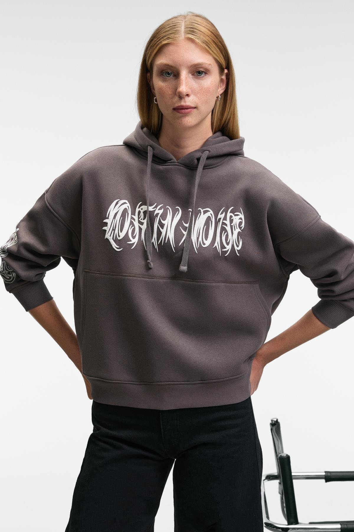 ALIRAYNE Kadın Baskılı Oversize Kapüşonlu Kanguru Cep Antrasit Sweatshirt