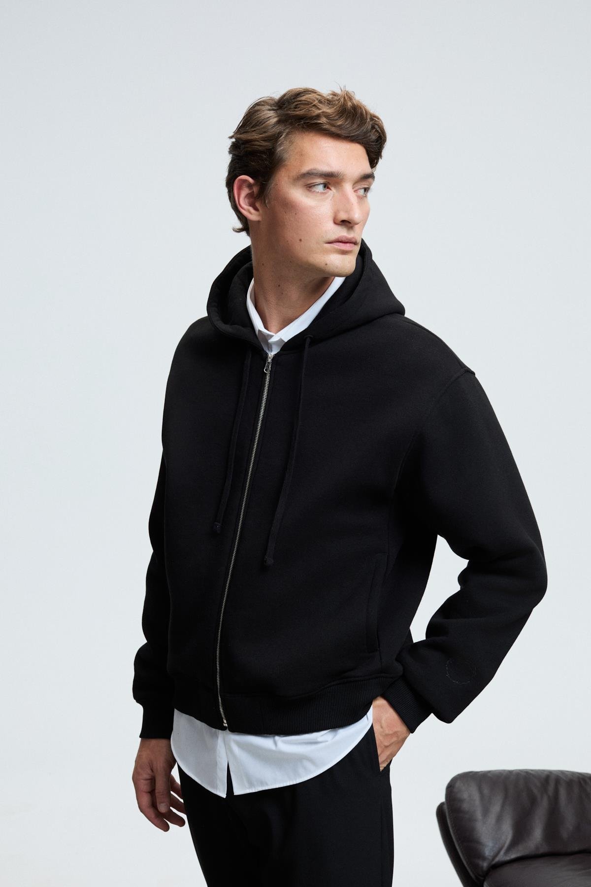 ASHBY Erkek Kapüşonlu Fermuarlı Cepli Kordonlu Regular Fit Siyah Sweatshirt