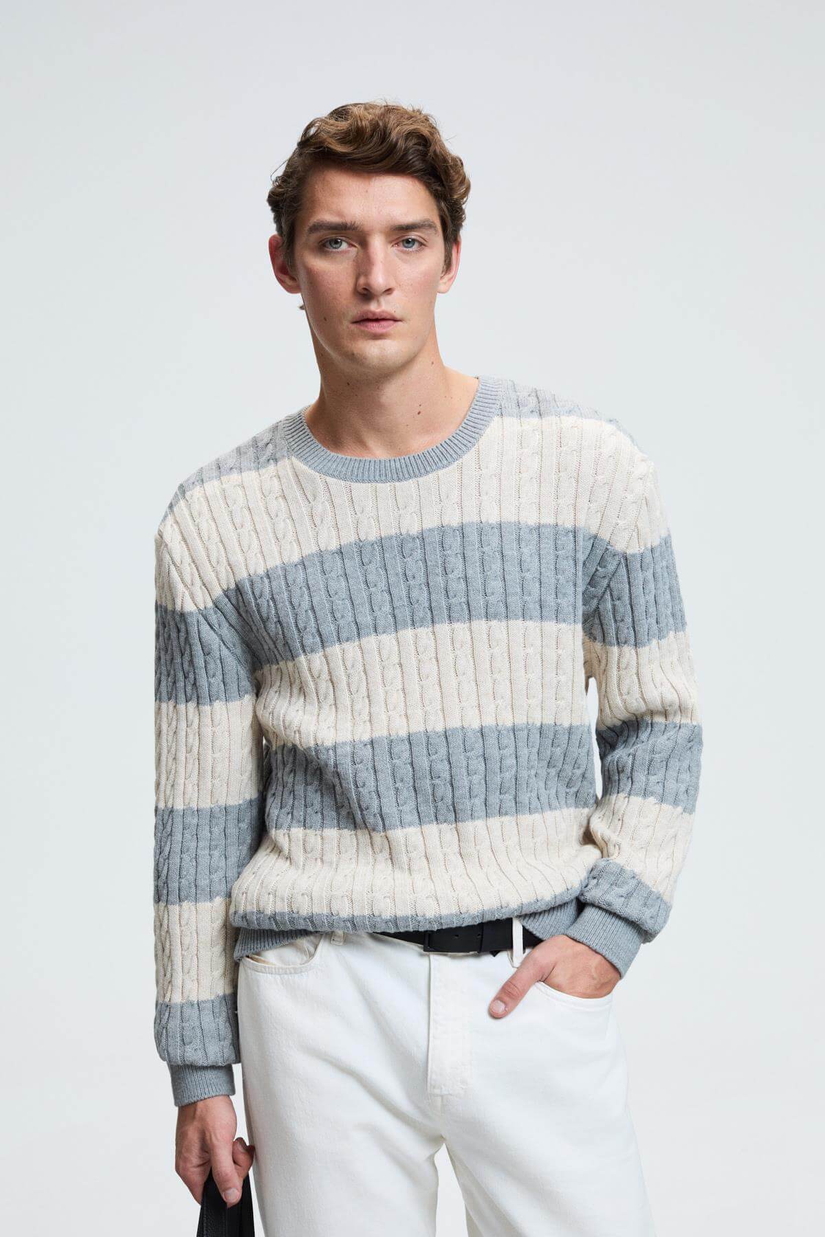 BRAID Erkek Yuvarlak Yaka Saç Örgü Desenli Regular Fit Grimelanj - Bej Kazak