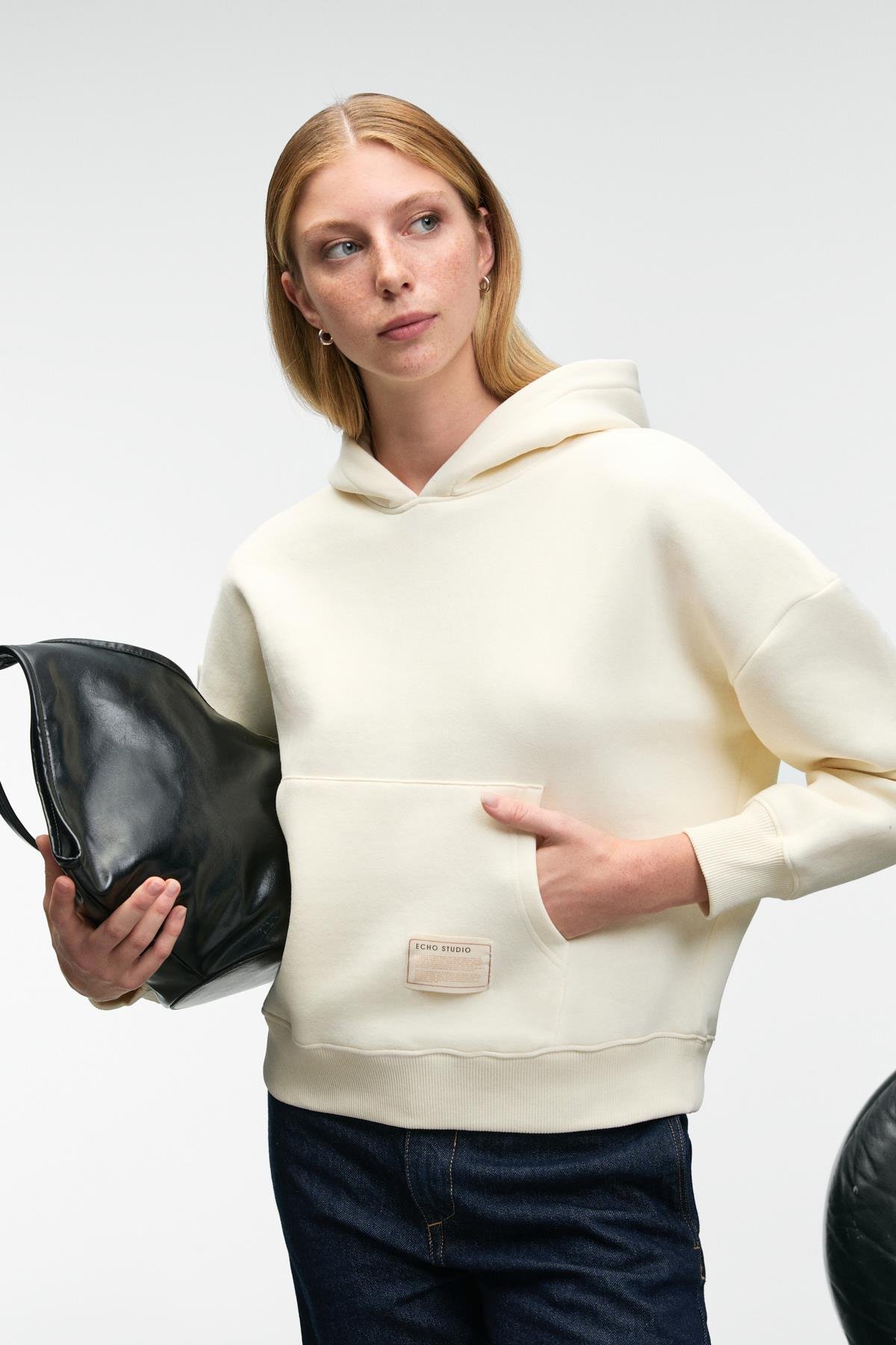 CLARIE Kadın Organik Pamuklu Oversize Kanguru Cepli Kapüşonlu Ekru Sweatshirt