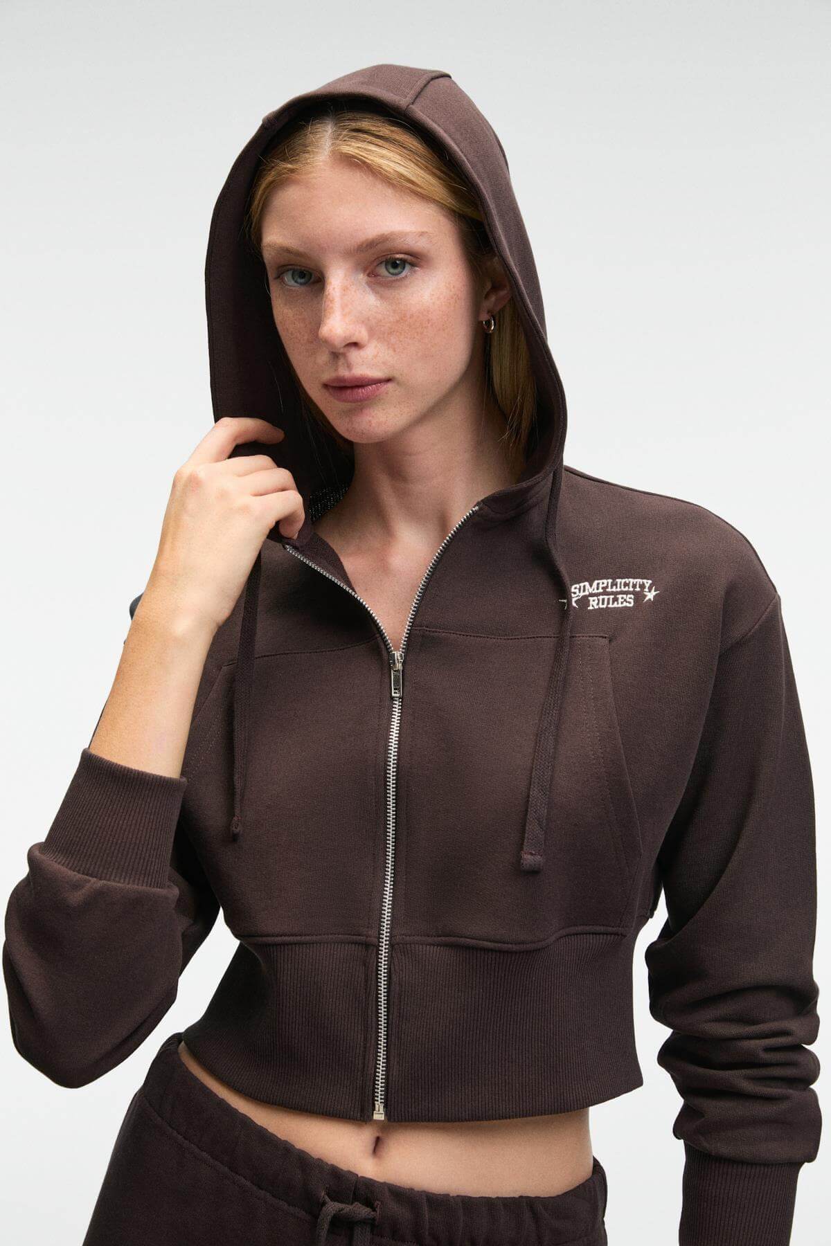 ELARA Kadın Metal Fermuarlı Nakışlı Kapüşonlu Crop Koyu Kahverengi Sweatshirt