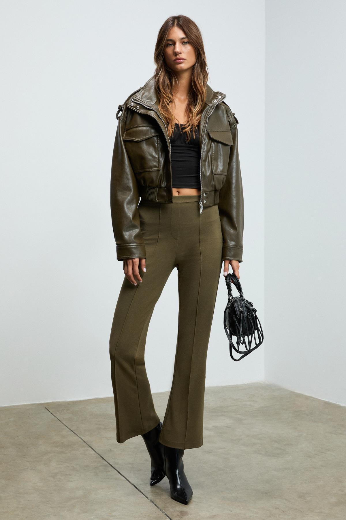 KALYYSIA Kadın Yüksek Bel Geniş Paçalı Slim Fit Haki Pantolon