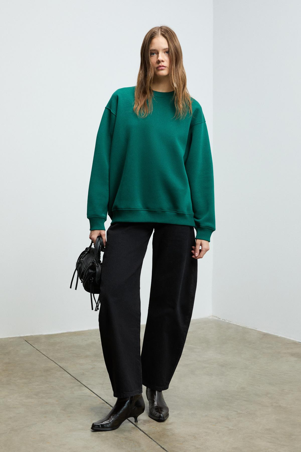 KARIUS Kadın Organik Pamuklu İçi Polarsız Oversize Yuvarlak Yakalı Koyu Yeşil Sweatshirt