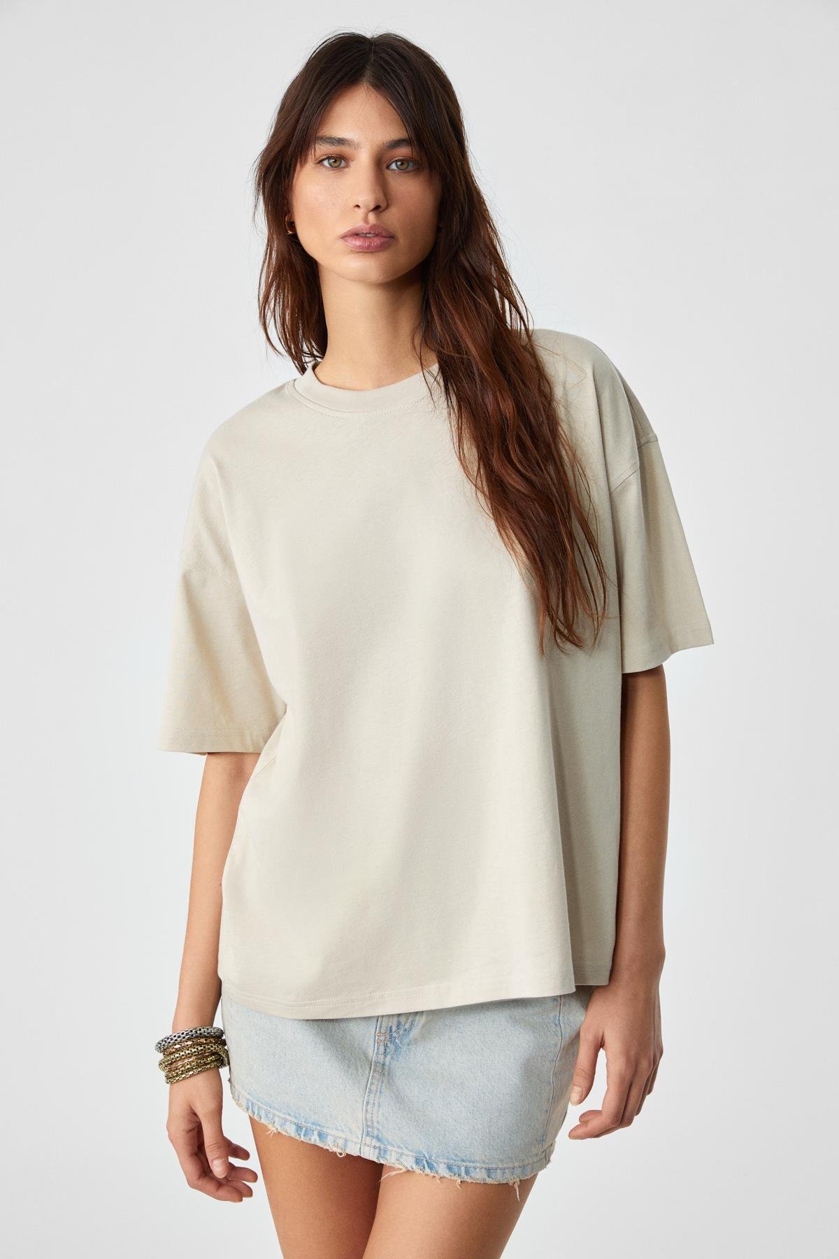 LAGERTHA Kadın %100 organik Pamuklu Kalın Dokulu Oversize Fit Yuvarlak Yakalı Taş Rengi T-Shirt
