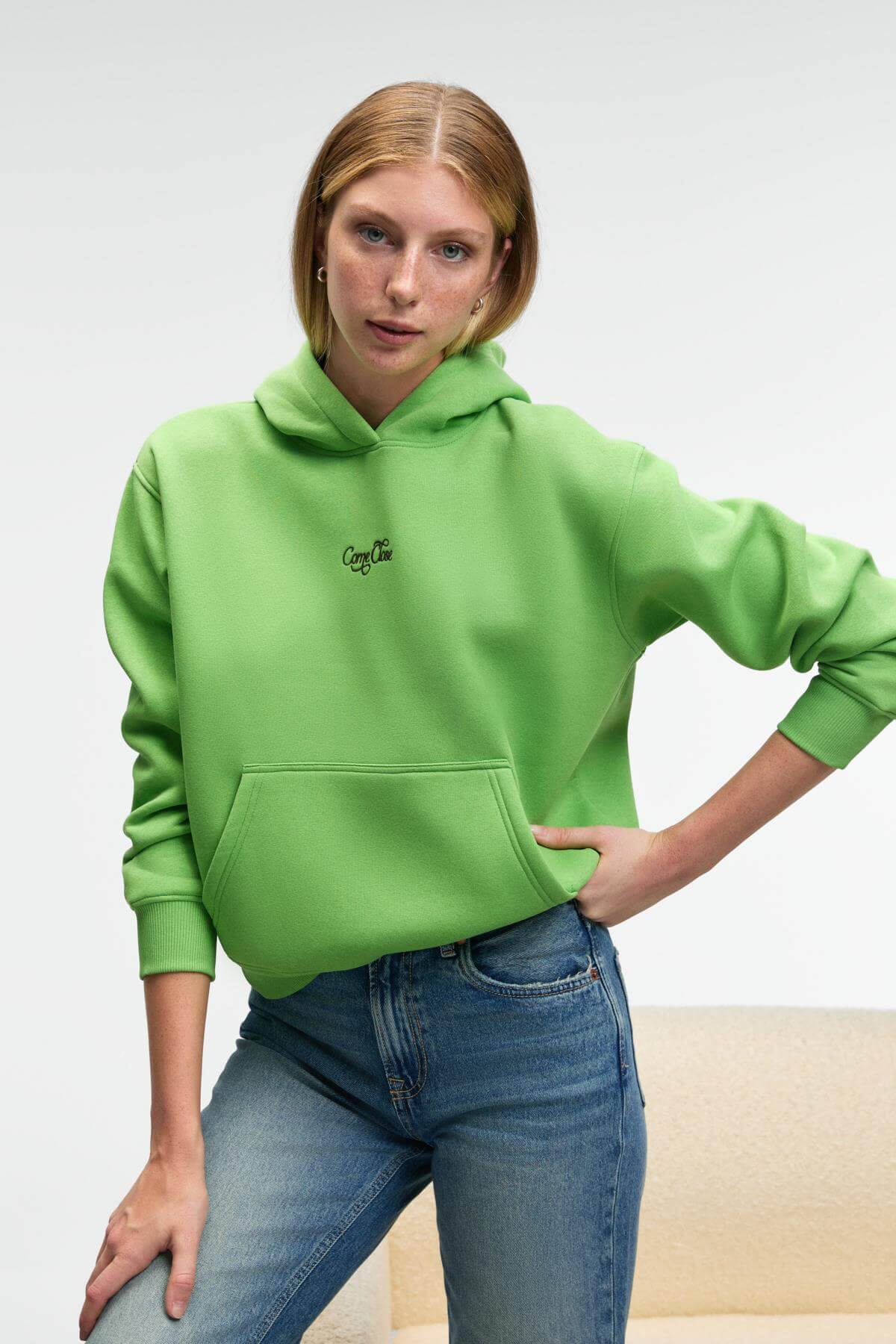 MELUREA Kadın Nakışlı Kapüşonlu Comfort Fit Fıstık Yeşili Sweatshirt