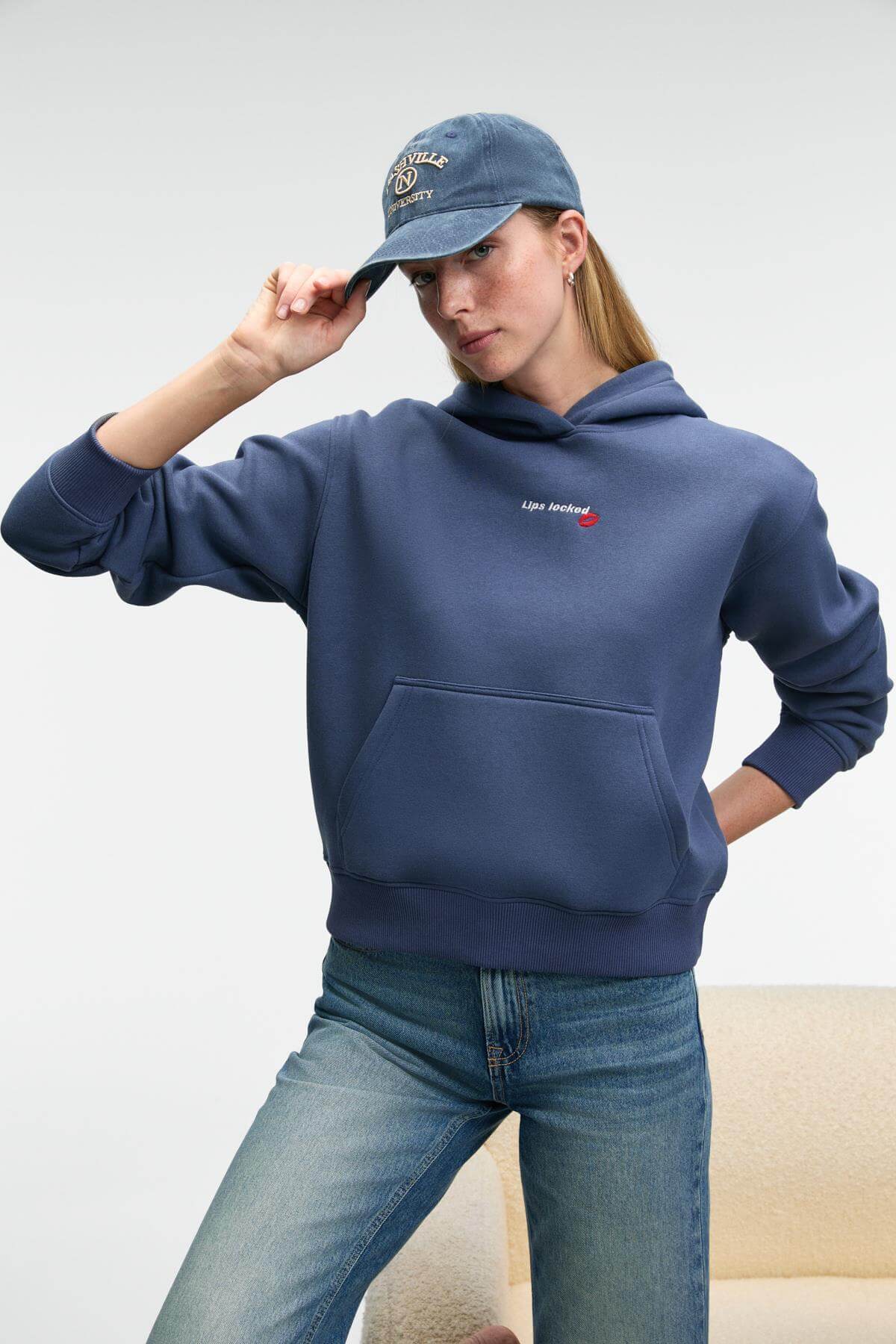 MELUREA Kadın Nakışlı Kapüşonlu Comfort Fit Koyu Mavi Sweatshirt