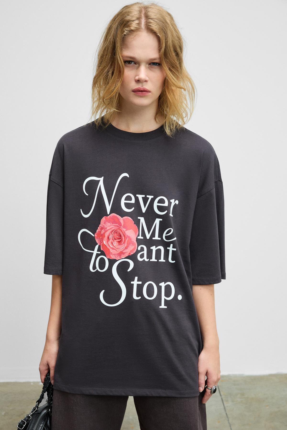 MOKILA Kadın Yumuşak Ve Esnek Kumaşlı Baskı Detaylı Bisiklet Yakalı Antrasit T-Shirt