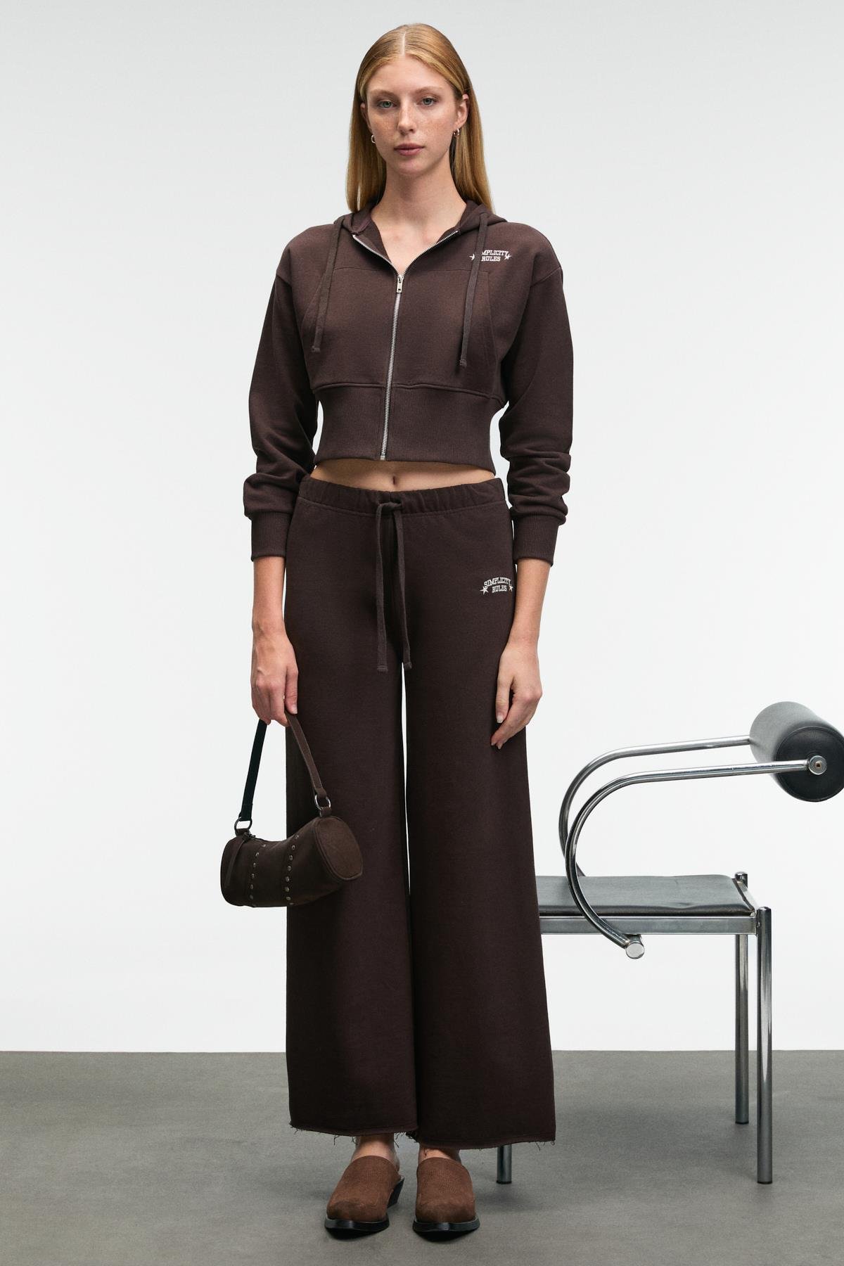 MORVELLA Kadın Nakışlı Regular Fit Koyu Kahverengi Eşofman Altı