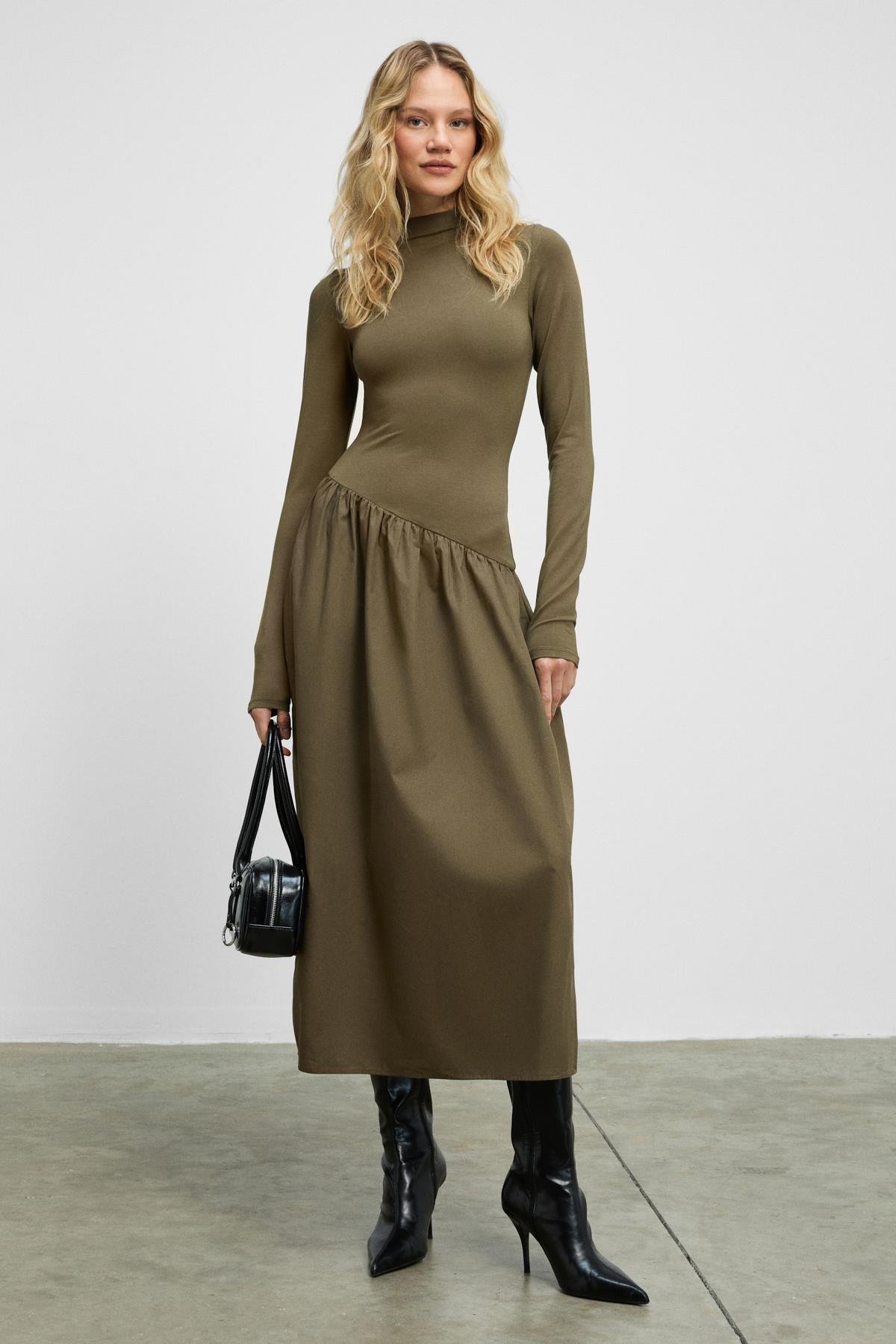 PANTI Kadın Üstü Ribana Eteği Poplin Vücuda Oturan Haki Elbise