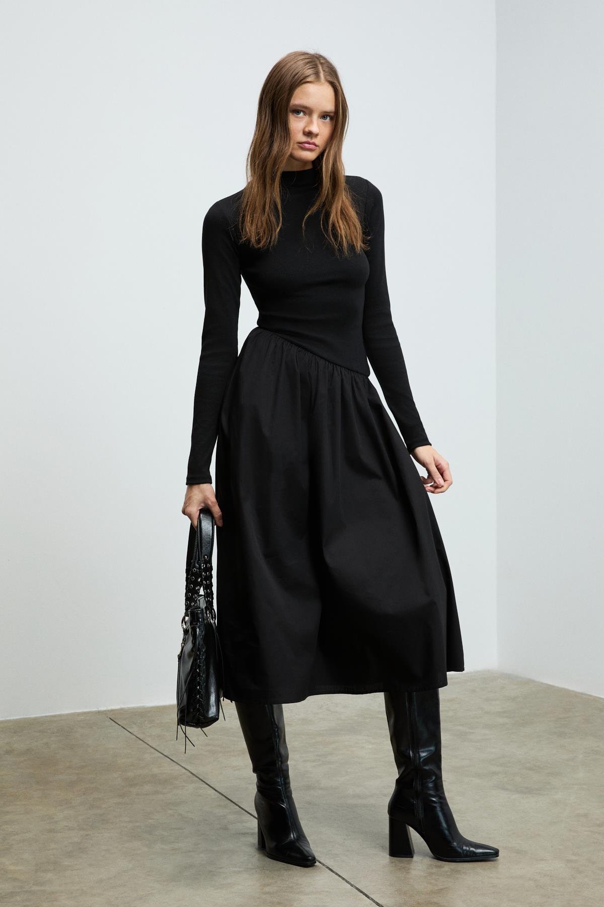 PANTI Kadın Üstü Ribana Eteği Poplin Vücuda Oturan Siyah Elbise