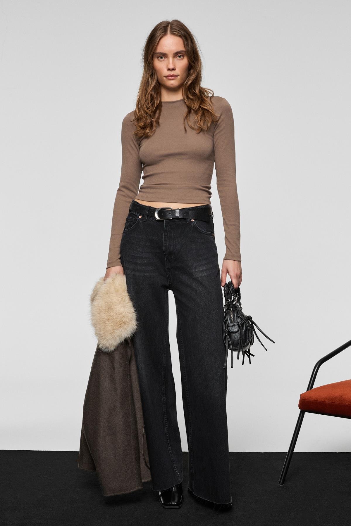 PIEDRA Kadın %100 Pamuk Geniş Paça Paçası Dikişsiz Bitişli Denim Siyah Jeans