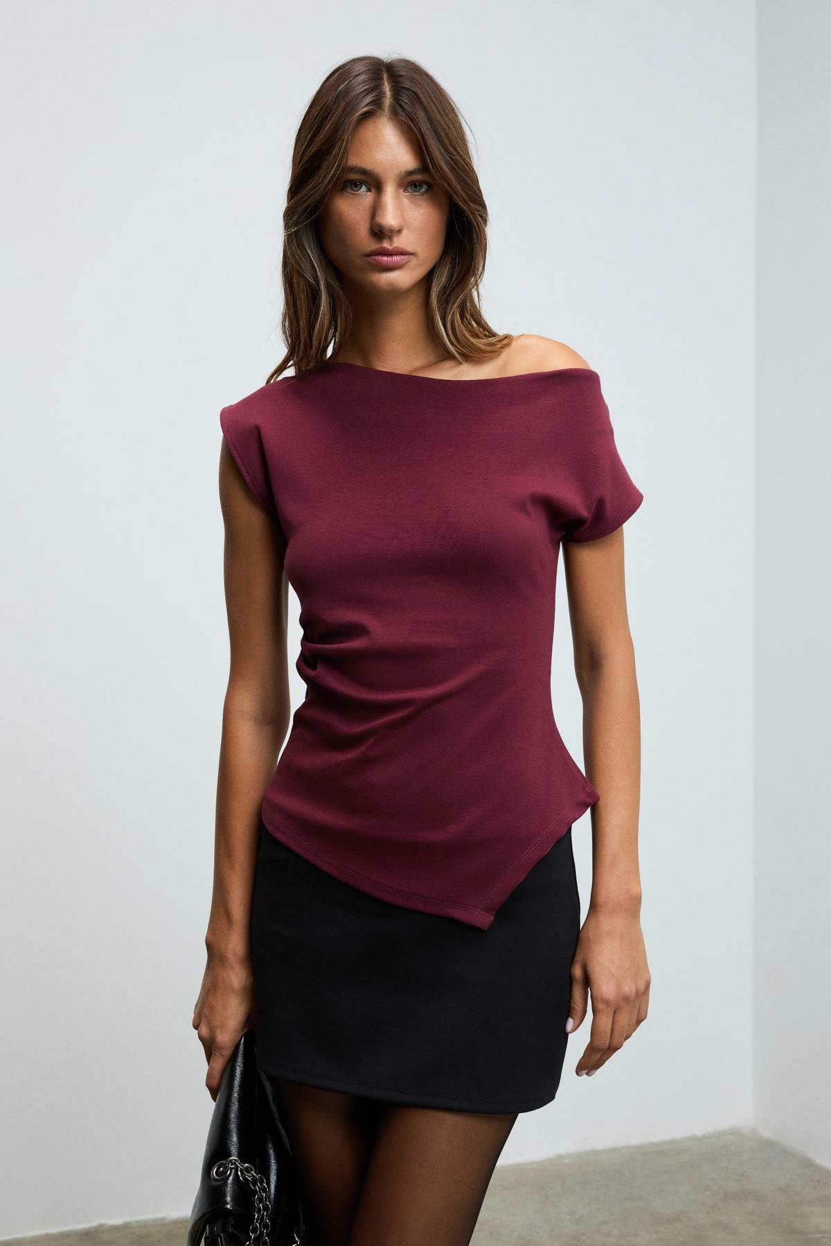 REHINGA Kadın Asimetrik Yaka Regular Kısa Kol Bordo Bluz