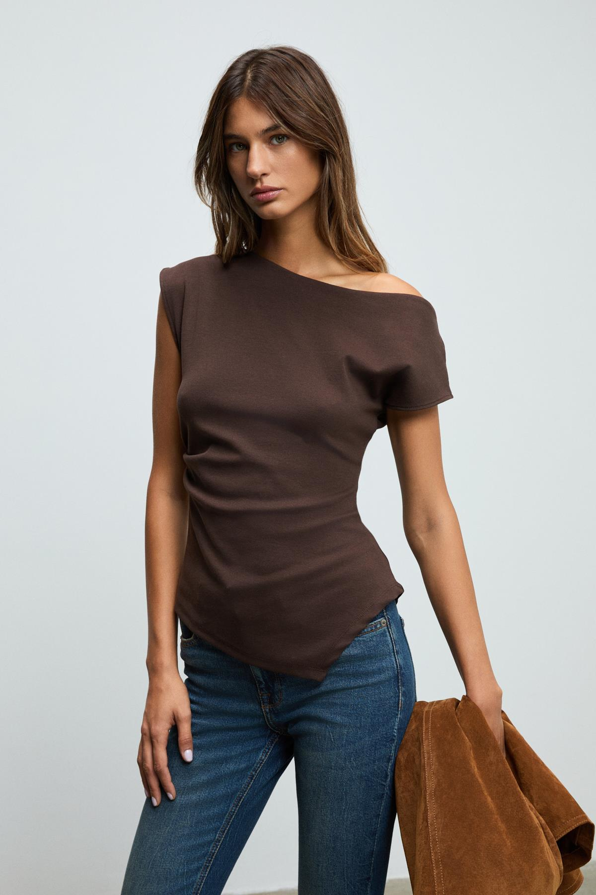 REHINGA Kadın Asimetrik Yaka Regular Kısa Kol Kahverengi Bluz