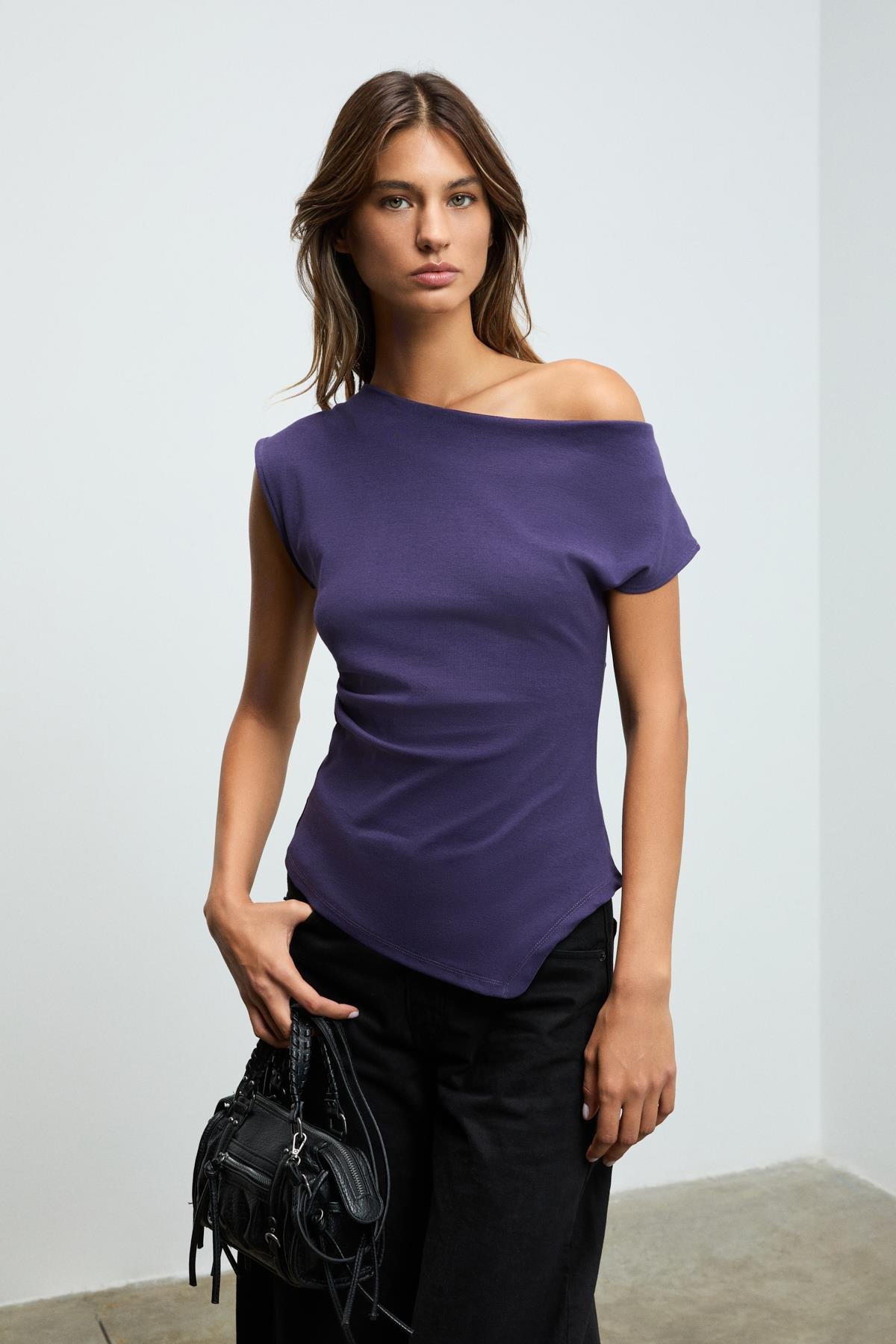 REHINGA Kadın Asimetrik Yaka Regular Kısa Kol Mor Bluz
