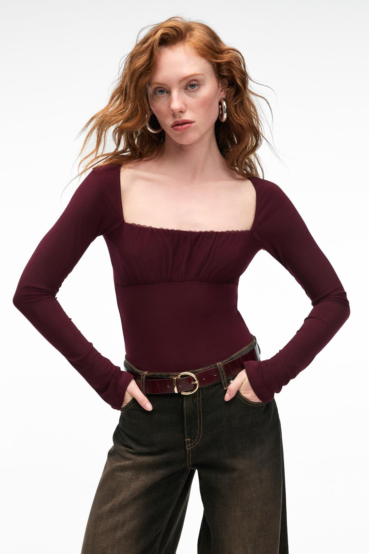SILIVRA Kadın Havuz Yakalı Esnek Kumaşlı Slim Fit Bordo Bluz