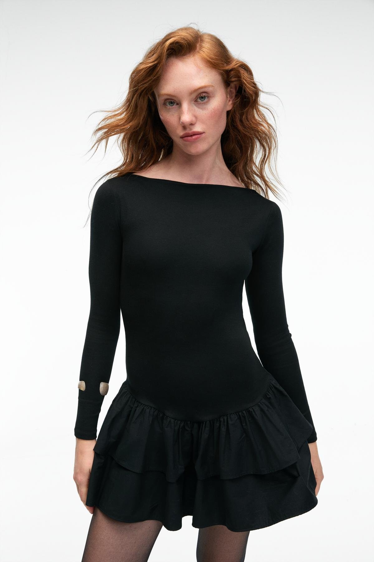 TRUSEA Kadın Üstü Esnek Eteği Dokuma Kumaşlı Regular Mini Siyah Elbise