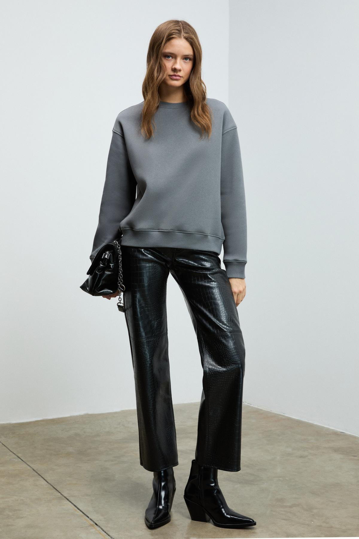VANELTINA Kadın Organik Pamuklu Yumuşacık İçi Polarlı Yuvarlak yakalı Gri Sweatshirt