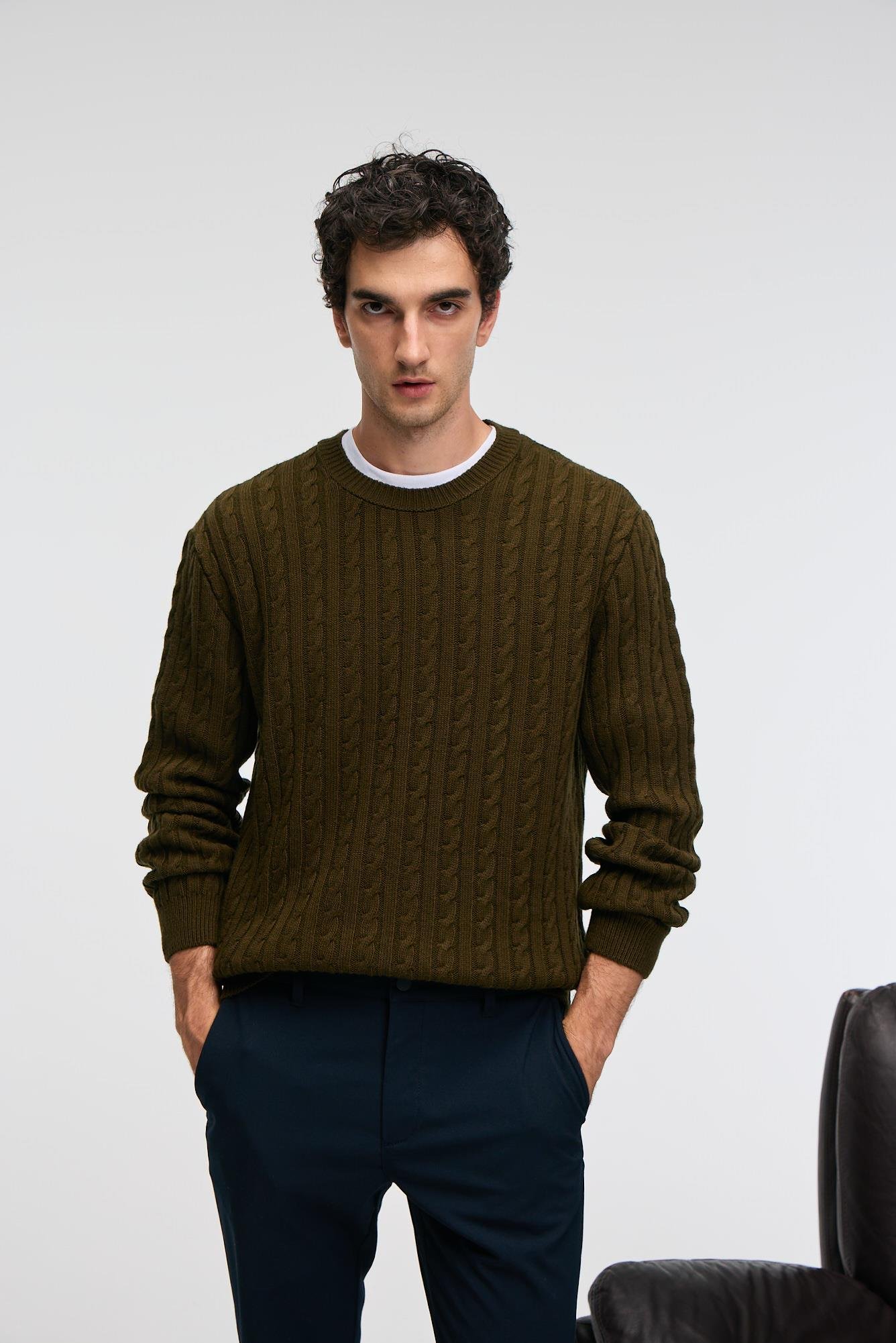 VINTLACE Erkek Yuvarlak Yaka Saç Örgü Desenli Regular Fit Triko Haki Kazak