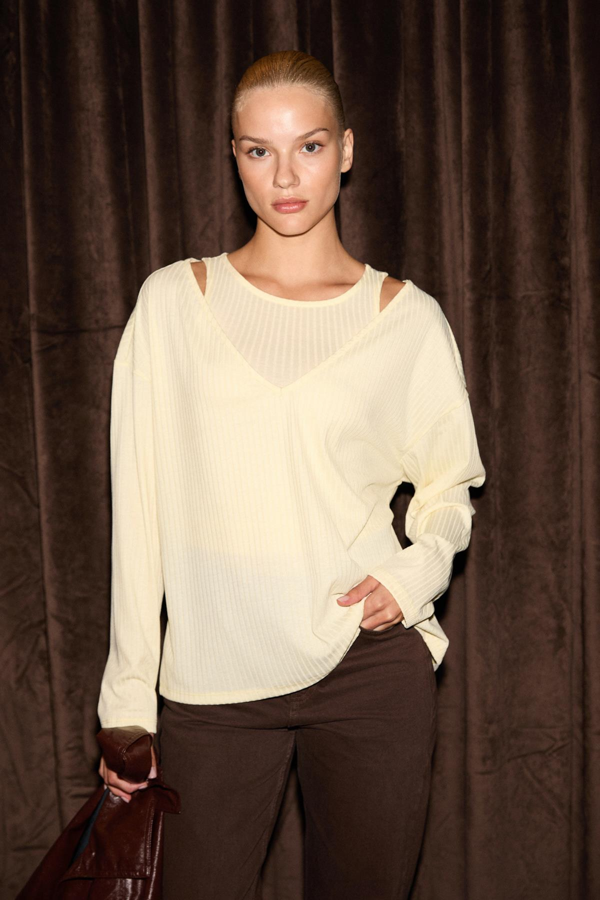 ZARREUS Kadın Omuz Dekolteli Esnek Kumaşlı Rahat Kalıp Sarı Bluz